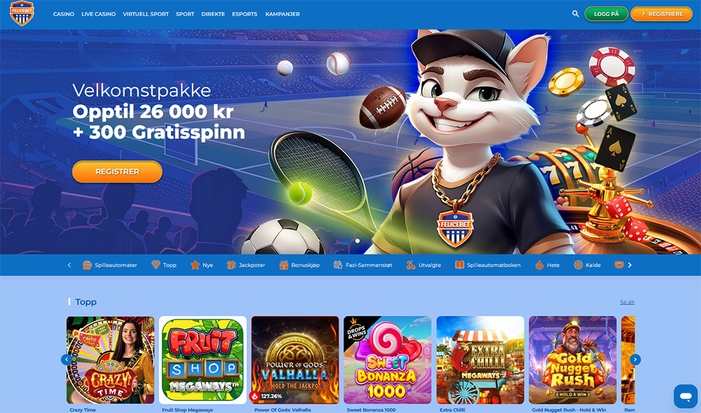 Felicebet organiserer spilleautomatene i kategorier som Topp, Nye, Utvalgte, Bøker, Hete, Kalde, Bonuskjøp, Megaways og Jackpotter.